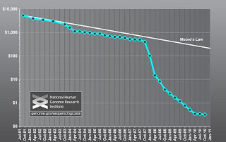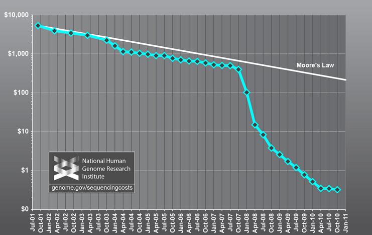 ნახ. 1: დნმ–ის სეკვენირების ღირებულების შემცირების ამსახავი სქემა. მურის კანონისთანახმად, ღირებულება წრფივად უნდა მცირდებოდეს, მაგრამ ამ შემთხვევაშისეკვენირების ფასი გაცილებით უფრო მკვეთრად იკლებს.