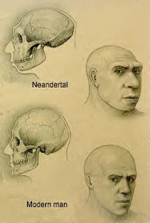 ნახ. 2, 3: ნეანდერტალელისა და თანამედროვე ადამიანის თავის ქალების შედარება და ამშედარების საფუძველზე აღდგენილი სახის ნაკვთები.