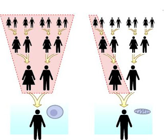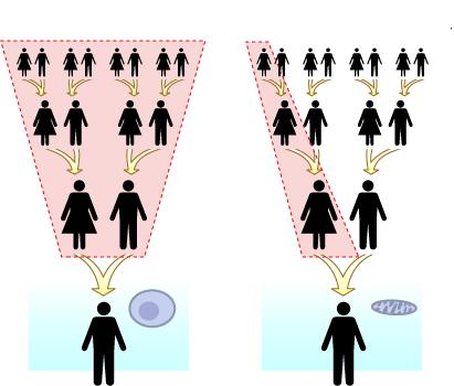 ნახ. 1: ბირთვული(მარცხნივ) და მიტოქონდრიული (მარჯვნივ) დნმ–ის მემკვიდრეობით გადაცემისმექანიზმების შედარება.