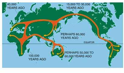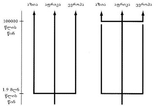 ნახ. 3: ადამიანებისგანსახლების შესაძლო სქემა „აფრიკიდან ჩანაცვლების“ მოდელის თანახმად.